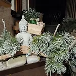 The kitchen amenities at Wohlfuehloase Naehe Gmunden 5Min Zum Traunsee Haus Mit 2 Schlafzimmer feature coffee and tea making equipment, a fridge, and kitchenware, provided in an outdoor dining area. The accommodation is also a stone's throw from Spar Ohlsdorf Sportzentrum bus station. A hot tub are available on-site.